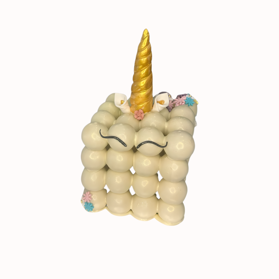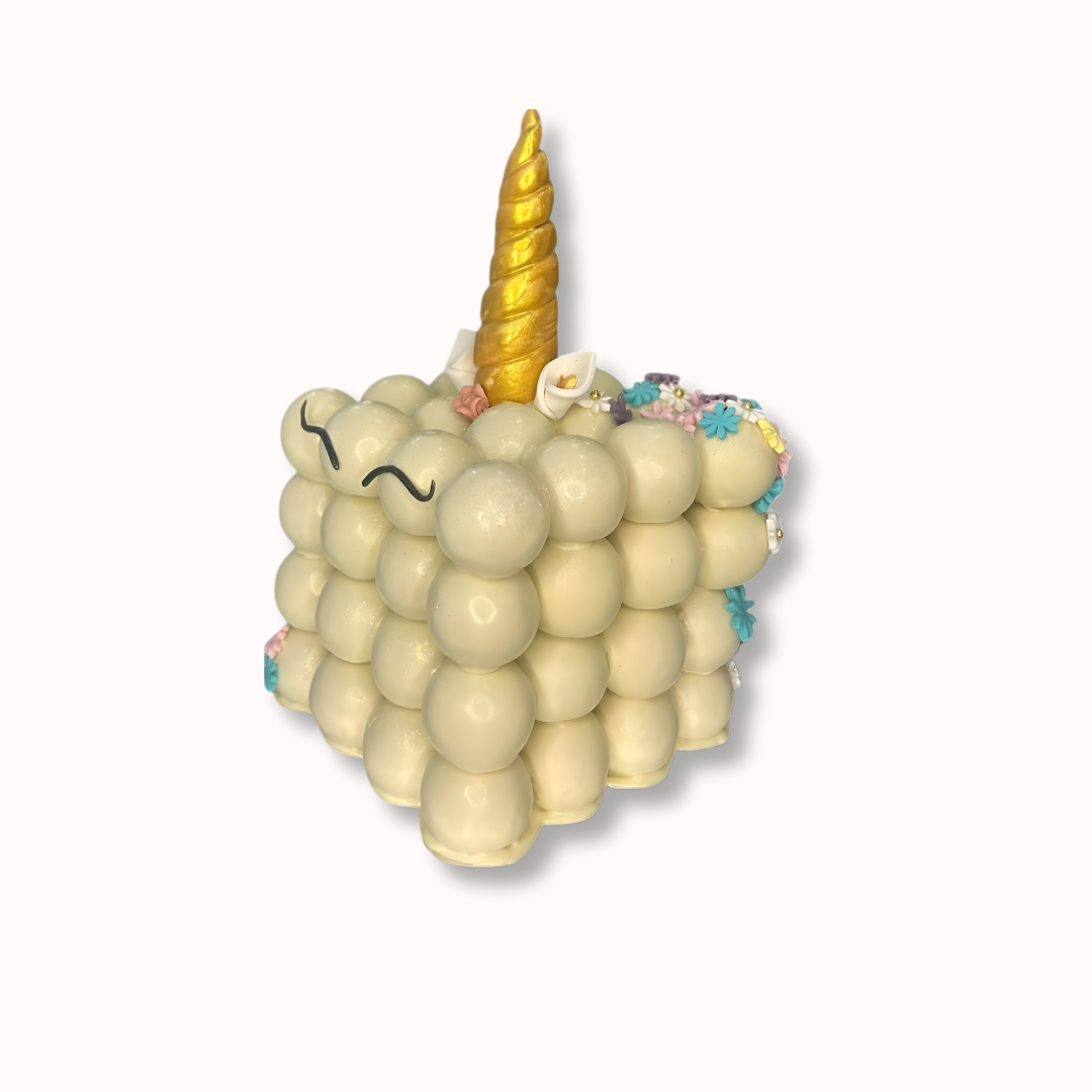 Our Unicorn Cakepop Cake is a dreamy delight that brings the magic of unicorns to life – one cakepop at a time! Crafted with over 50 hand-rolled cakepops, this show-stopping cube is coated in a luscious vanilla glaze, adorned with pastel florals, and topped with a golden unicorn horn. It's the perfect centrepiece for birthdays, baby showers, or anyone who believes in a little magic.