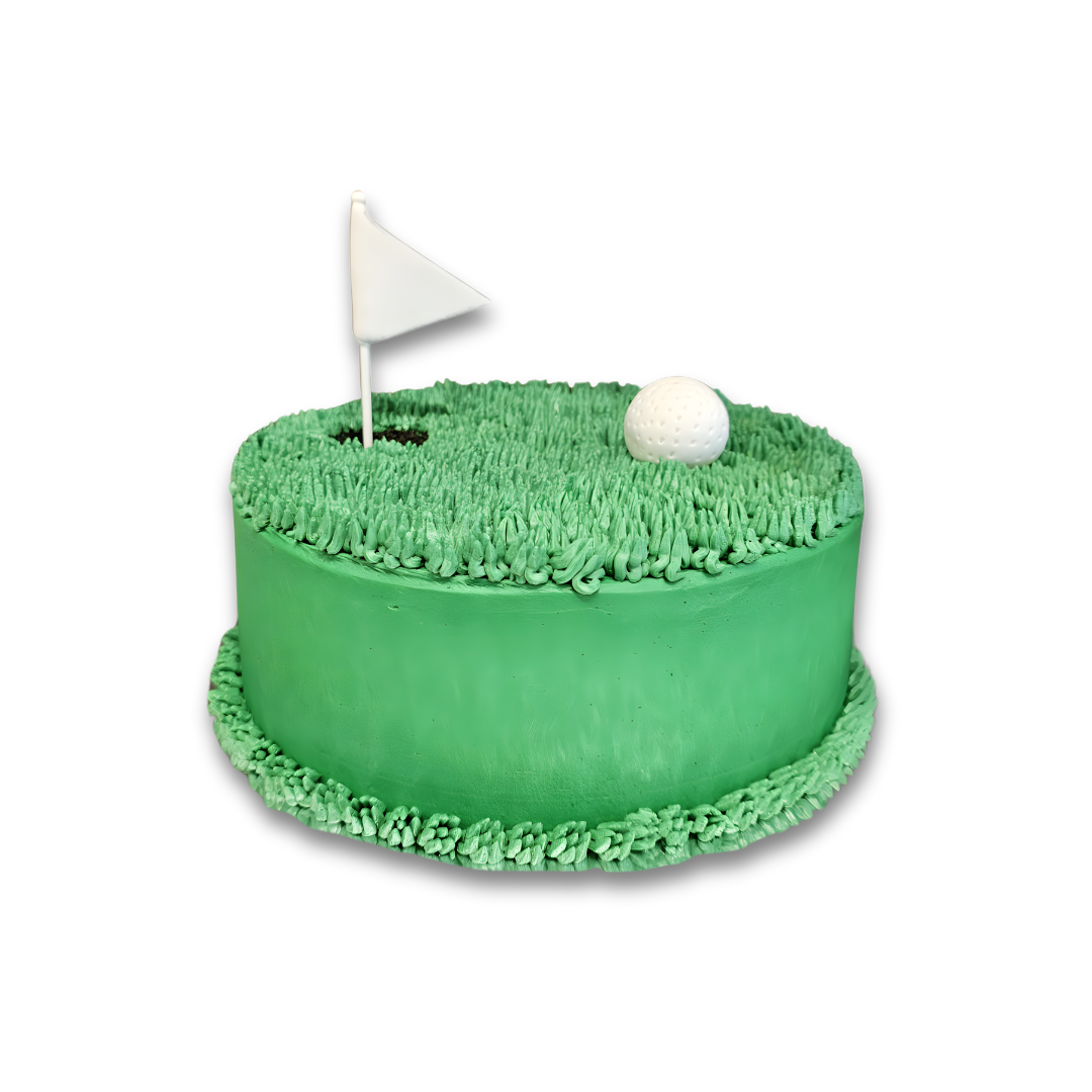 Our Golf Cake is covered in smooth green buttercream, textured to look just like a fresh-cut putting green, complete with an edible golf ball and mini flag ready for a “hole in one” photo moment.