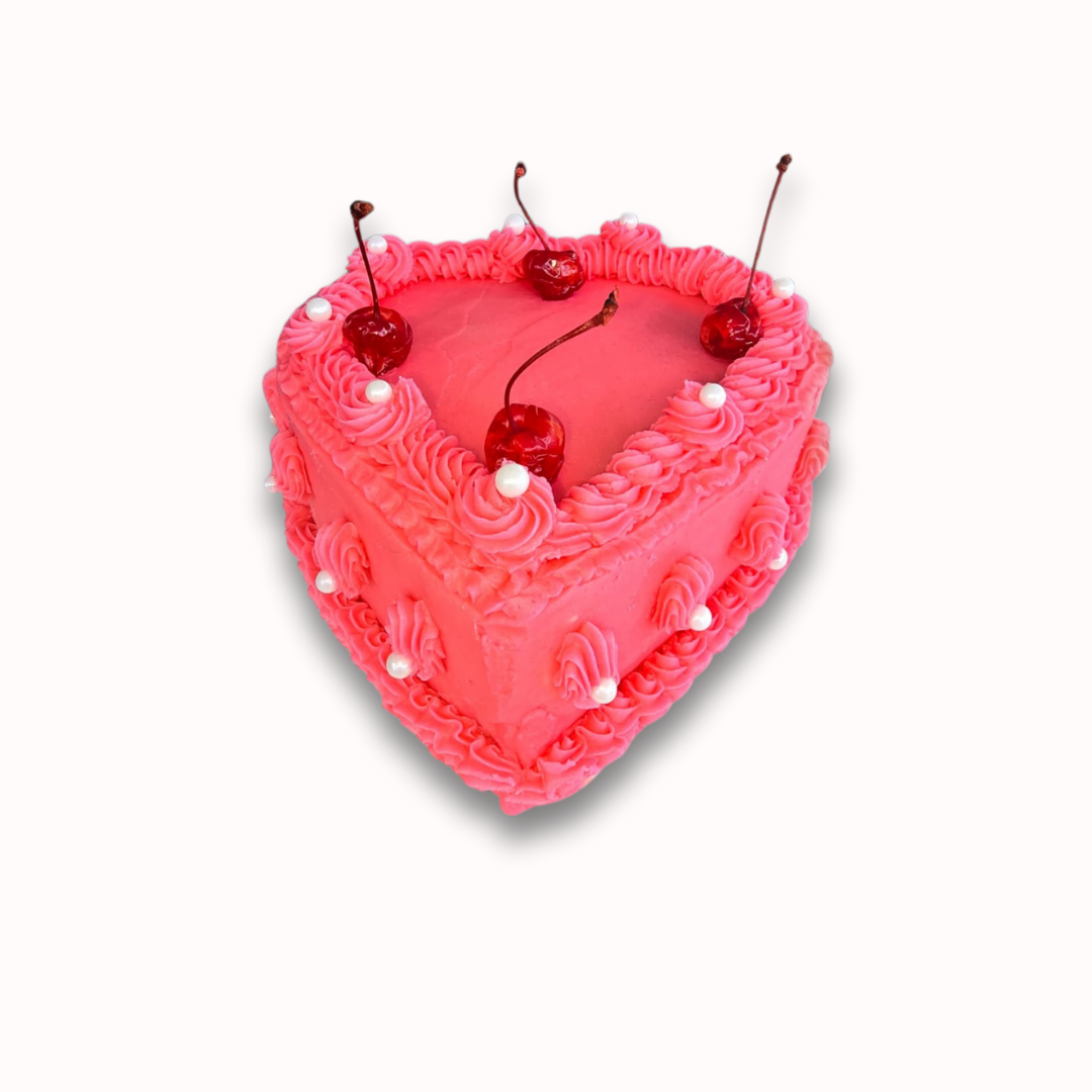 Channel all the retro romance with our Vintage Love Heart Cake. This sweet pink heart is decorated with old-school buttercream piping, glossy cherries and delicate sugar pearls for that perfect 80s–90s bakery nostalgia moment. It’s cute, fun and made to be the centre of attention.