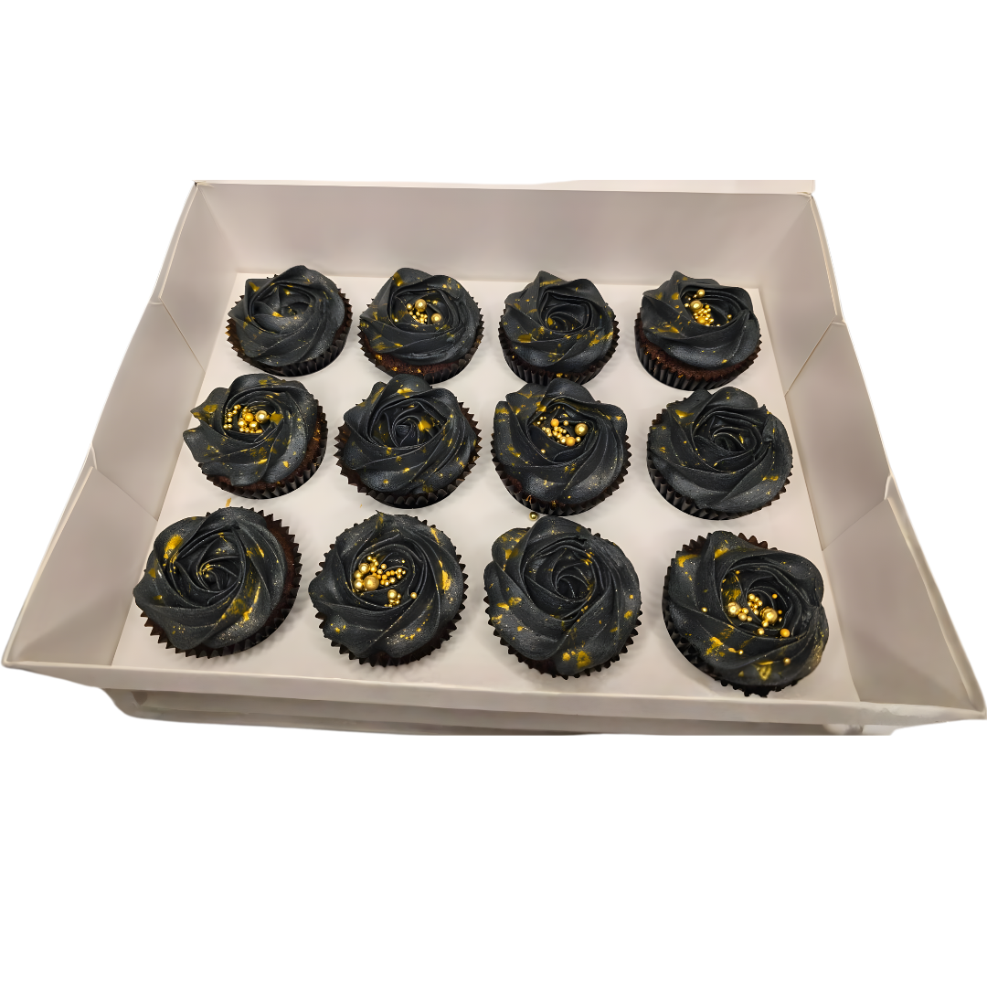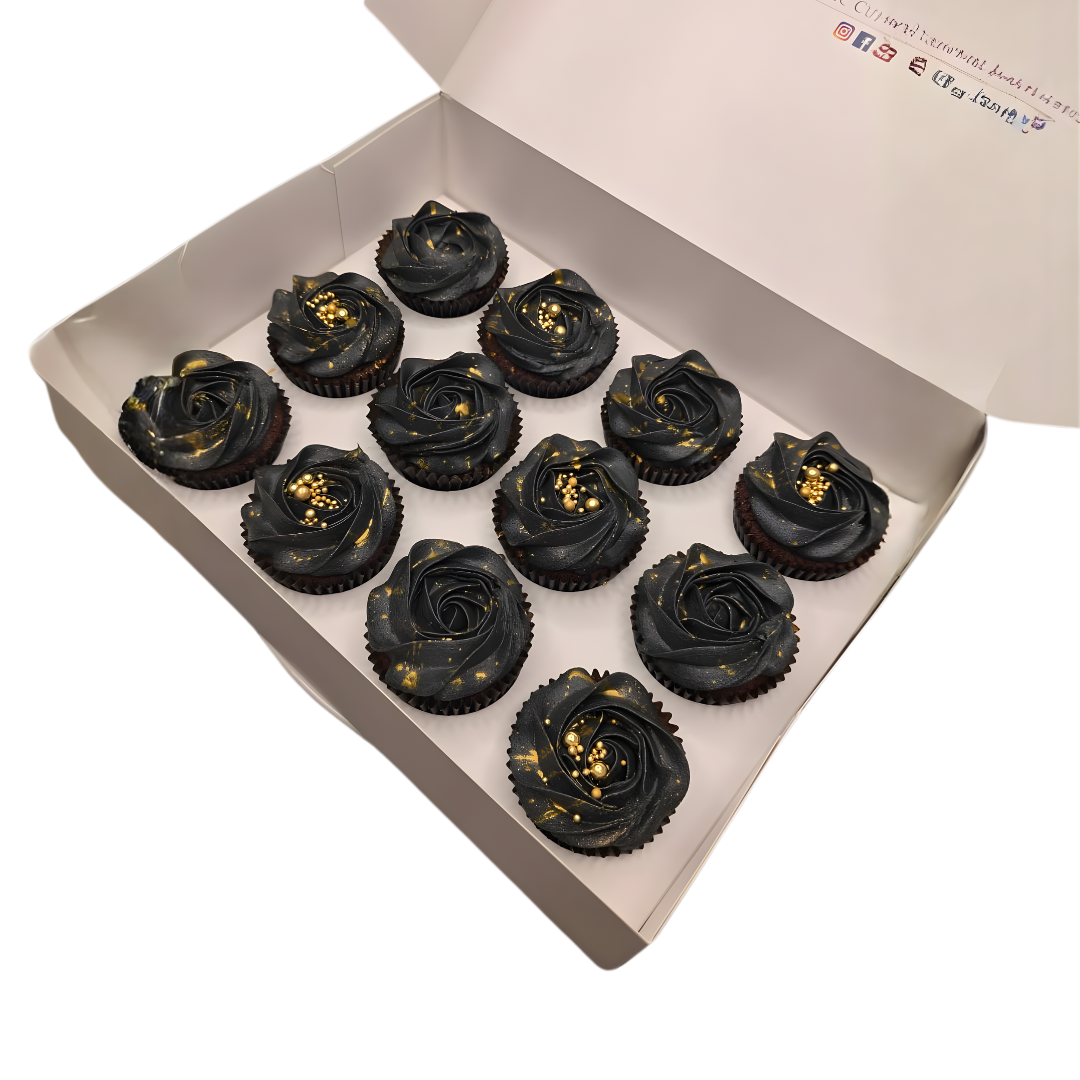 Our Black & Gold Assorted Cupcakes feature rich chocolate cupcakes topped with midnight-black buttercream roses, splattered with edible gold, and finished with clusters of gold pearls on selected cupcakes for extra luxury.