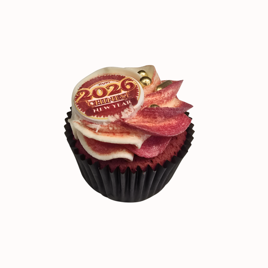 Celebrate Lunar New Year 2026 – Year of the Horse – with a little bite of good luck! Our Chinese New Year Cupcake features a rich red velvet base topped with silky vanilla buttercream, hand-swirled in festive red and ivory tones. Each cupcake is finished with an edible printed topper and golden pearls for that extra touch of prosperity and sparkle.
