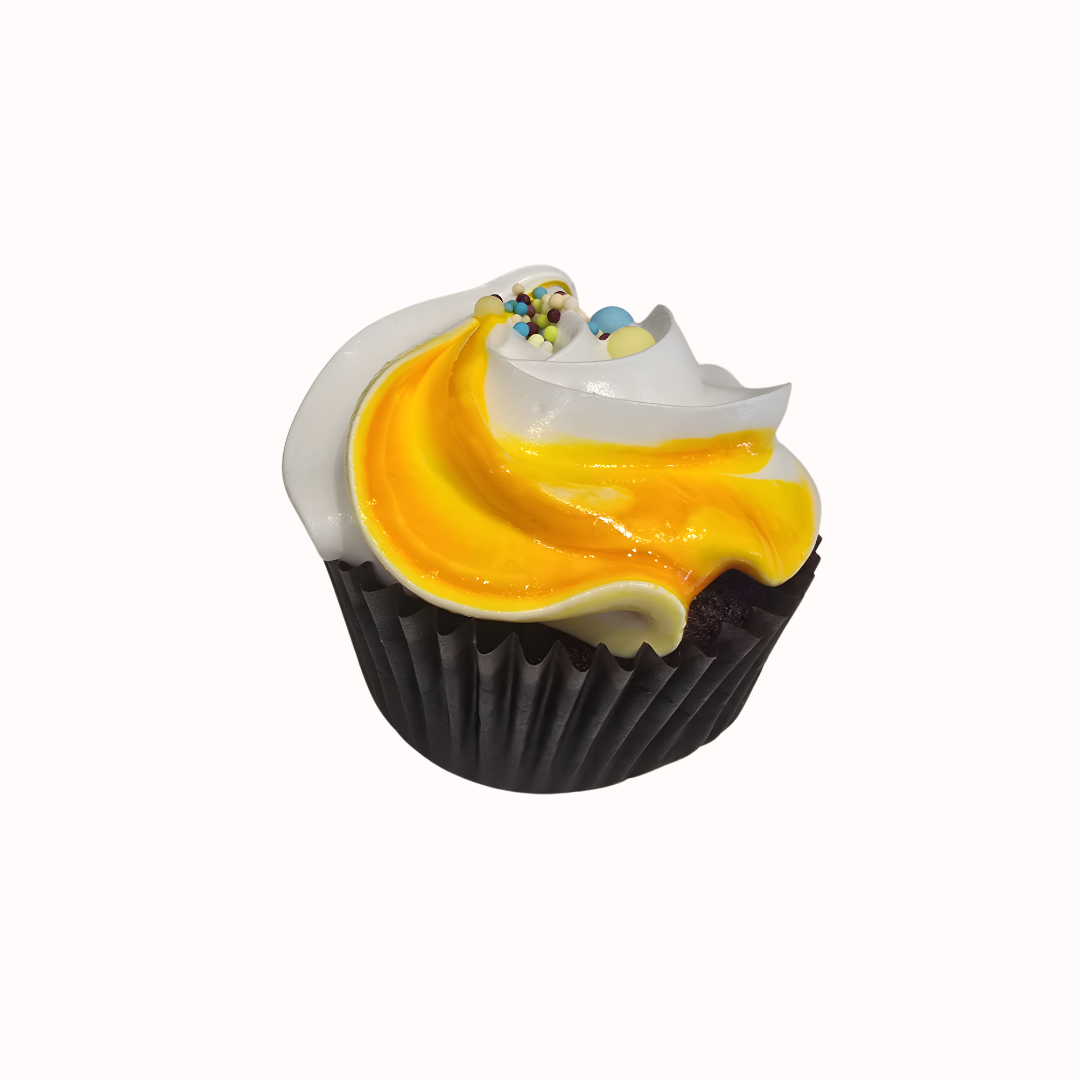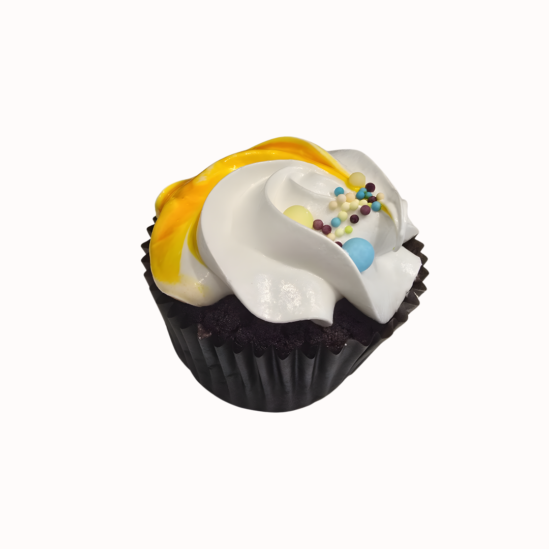 Light as a cloud, rich as a brownie – our Chocolate Meringue Cupcake is all about contrast in the best way. A fudgy chocolate base is topped with a swirl of glossy vanilla meringue, streaked with sunshine-yellow and finished with playful pastel sprinkles.
