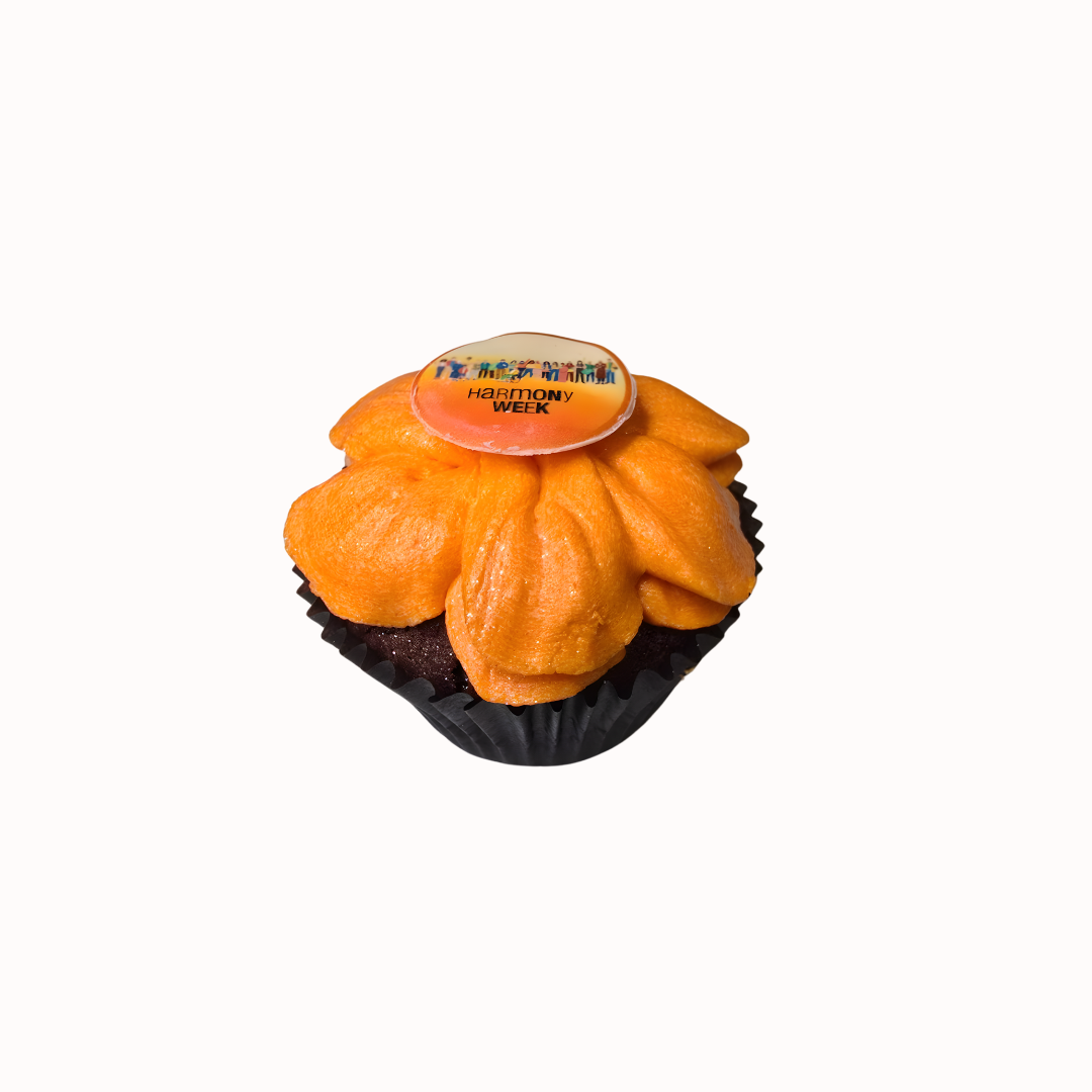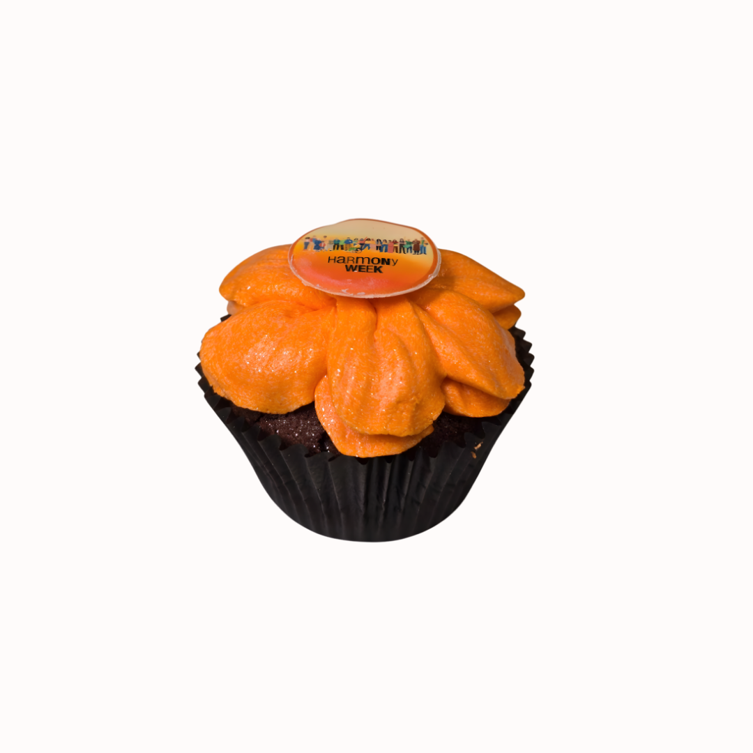 This eye-catching cupcake features a rich, moist base topped with a generous swirl of bright orange buttercream, the colour of Harmony Day, and finished with a themed topper that represents inclusion and community. It’s a simple yet powerful way to share a sweet message while enjoying a beautifully crafted dessert.