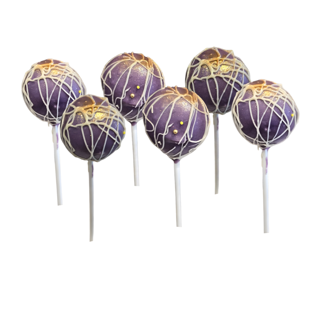 Our luxe Purple CakePOPs are dipped in a rich violet Callebaut coating, finished with a touch of edible gold shimmer, delicate white chocolate drizzle and tiny gold pearls. They’re the perfect showpiece for birthdays, hens’ nights, baby showers or any dessert table that needs a little glam.