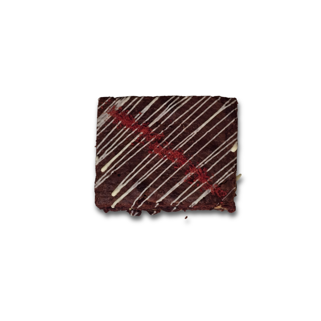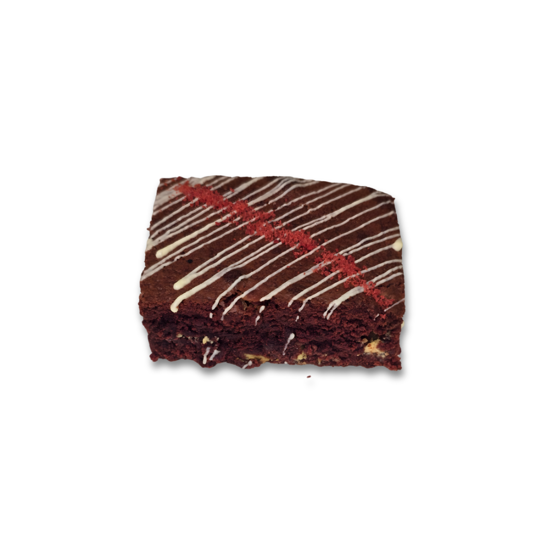 This decadent brownie features a soft, fudgy red velvet base studded with creamy white chocolate, finished with a delicate drizzle on top for an extra touch of sweetness. It delivers a smooth, slightly tangy flavour paired with the richness of white chocolate, creating a luxurious treat in every bite.