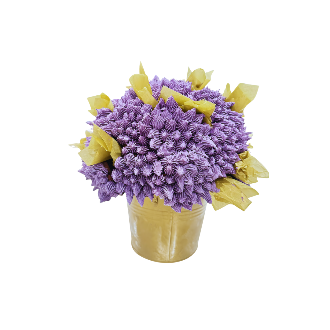 Our Purple Succulents Bouquet is a gorgeous illusion – it looks like a lush pot of succulents, but every “petal” is silky buttercream piped onto hidden cupcakes. Shades of soft purple, textured like real succulents and nestled in a gold pot, make this the perfect edible gift.